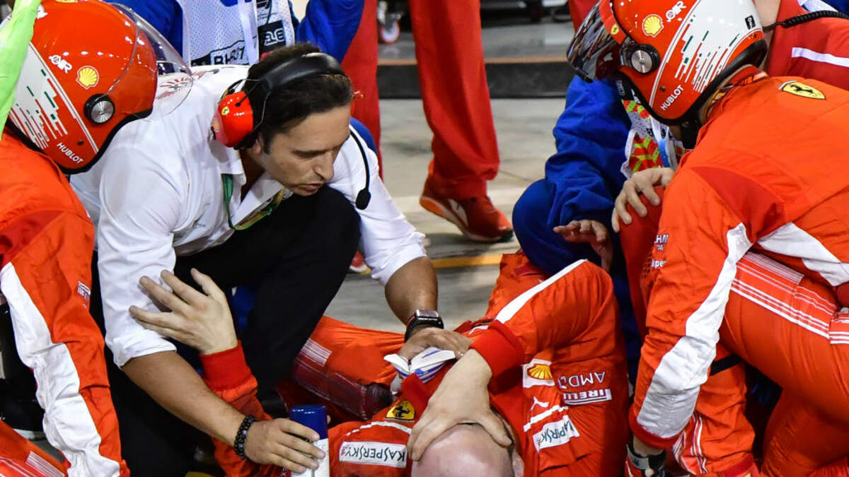 The Ferrari mechanic who was hospitalized with a broken leg after being struck by Kimi Raikkonen's car says he is ''OK'' following surgery. On Instagram, Francesco Cigarini wrote ''Surgery ok. I have to thank all the people worried for me.'' Cigarini included a photo of himself on a hospitable bed giving the thumbs up with his left leg covered in a cast from his thigh down to his toes. The post was liked by Raikkonen. The incident occurred during a botched tire change at the Bahrain Grand Prix on Sunday. As Raikkonen pulled away, his rear left tire hit Cigarini's leg, knocking him to the ground. Ferrari said Cigarini likely sustained a ''shinbone and fibula fracture.'' Ferrari driver Sebastian Vettel won the race.